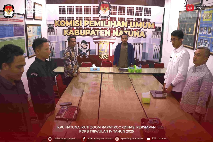 Natuna - Komisi Pemilihan Umum (KPU) Kabupaten Natuna menghadiri Rapat Koordinasi Persiapan Pemutakhiran Data Pemilih Berkelanjutan (PDPB) Triwulan IV Tahun 2025 yang diselenggarakan secara daring oleh KPU Provinsi Kepulauan Riau. Kegiatan ini diikuti oleh s Ketua KPU Natuna Kusnaidi, Anggota KPU Bahrul Amin, Anggota KPU Tomi Yanto, Plt. Kasubbag, serta staf Divisi Teknis. Rapat koordinasi ini bertujuan untuk mempersiapkan pelaksanaan PDPB Triwulan IV Tahun 2025, termasuk menyusun strategi pemutakhiran data pemilih, mengidentifikasi kendala di lapangan, dan mengevaluasi capaian triwulan sebelumnya. Dalam pemaparannya, perwakilan KPU Provinsi Kepulauan Riau menekankan pentingnya ketepatan waktu, akurasi data, dan sinergi antar divisi dalam menyukseskan tahapan ini. ....