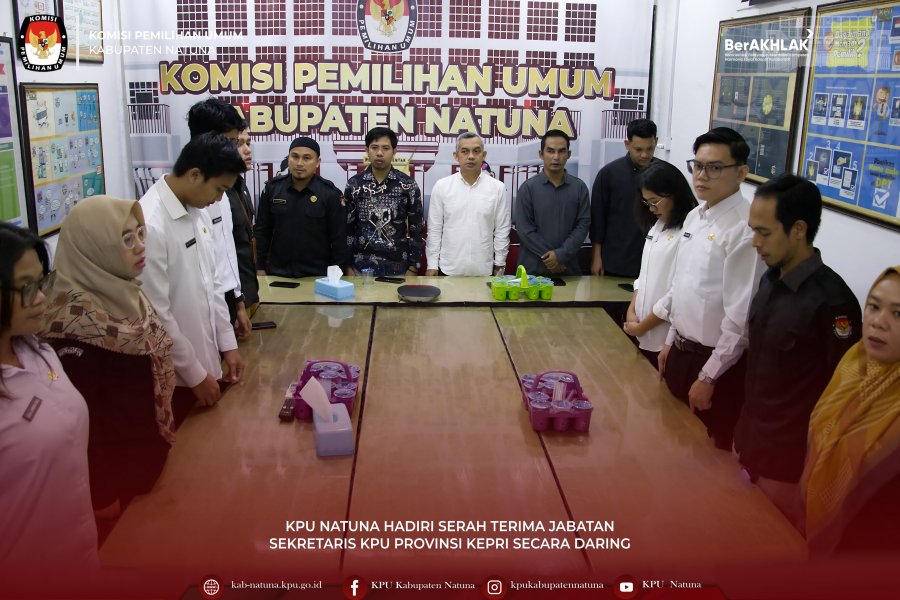 Natuna – Komisi Pemilihan Umum (KPU) Kabupaten Natuna mengikuti secara daring acara Serah Terima Jabatan (Sertijab) Sekretaris KPU Provinsi Kepulauan Riau pada Rabu, 26 November 2025. Kegiatan yang diselenggarakan secara hybrid dari kantor KPU Provinsi Kepri ini dihadiri oleh seluruh jajaran KPU se-provinsi, termasuk secara virtual oleh seluruh anggota dan sekretariat KPU Kabupaten Natuna. Kehadiran dalam acara ini menunjukkan komitmen KPU Natuna untuk menjaga harmonisasi dan sinergi yang solid antara struktur kepengurusan di tingkat provinsi dan kabupaten. Dalam kegiatan tersebut, tugas dan tanggung jawab Sekretaris KPU Provinsi Kepulauan Riau resmi dialihkan dari Plt. Sekretaris Drs. Nur Wakit Aliyusron, M.AP. kepada Anwar, S.S., M.Adm.Pemb. Ketua KPU Provinsi Kepulauan Riau, Indrawan Susilo Prabowoadi, bersama Anggota KPU Provinsi Kepulauan Riau yaitu Jernih Milyati Siregar, Ferry Muliadi Manalu, Priyo Handoko, dan Muhammad Sjahri Papene, menyampaikan apresiasi atas pengabdian Sekretaris sebelumnya serta ucapan selamat kepada Sekretaris yang baru. Terima kasih atas kontribusi dan pengabdian yang telah diberikan oleh Drs. Nur Wakit Aliyusron, M.AP., dan selamat bertugas kepada Anwar, S.S., M.Adm.Pemb. Semoga amanah ini dapat dijalankan dengan penuh integritas dan tanggung jawab dalam mendukung kinerja kelembagaan KPU Provinsi Kepulauan Riau. ....