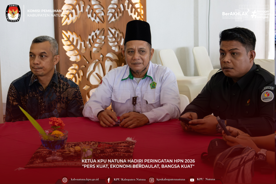 #TemanPemilih – Ketua Komisi Pemilihan Umum (KPU) Kabupaten Natuna, Kusnaidi, menghadiri acara peringatan Hari Pers Nasional (HPN) Tahun 2026 tingkat Kabupaten Natuna, yang diselenggarakan di Adiwana Jelita Sejuba, pada Senin, 9 Februari 2026. Kegiatan yang mengusung tema nasional "Pers Kuat, Ekonomi Berdaulat, Bangsa Kuat" ini menjadi momentum untuk memperkuat sinergi antara penyelenggara pemilu dan insan pers dalam membangun kesadaran demokrasi. ....