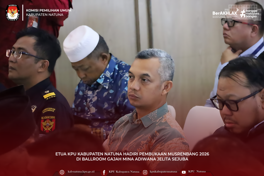 #TemanPemilih – Ketua Komisi Pemilihan Umum (KPU) Kabupaten Natuna menghadiri acara Pembukaan Musyawarah Rencana Pembangunan (Musrenbang) Kabupaten Natuna Tahun 2026. Acara ini berlangsung pada Selasa, 10 Februari 2026, bertempat di Ballroom Gajah Mina Adiwana Jelita Sejuba Resort, Sepempang. Undangan resmi yang dikeluarkan oleh Sekretaris Daerah Kabupaten Natuna mengatur acara dimulai pukul 08.30 WIB. Sebagai bentuk kehadiran dan partisipasi dalam proses perencanaan pembangunan daerah, Ketua KPU Natuna turut hadir dalam forum strategis tersebut. Keikutsertaan Ketua KPU dalam Musrenbang menunjukkan komitmen lembaga tersebut dalam mendukung transparansi dan sinergi program pembangunan daerah, sejalan dengan fungsi pengawasan dan partisipasi publik dalam tata kelola pemerintahan yang baik. ....