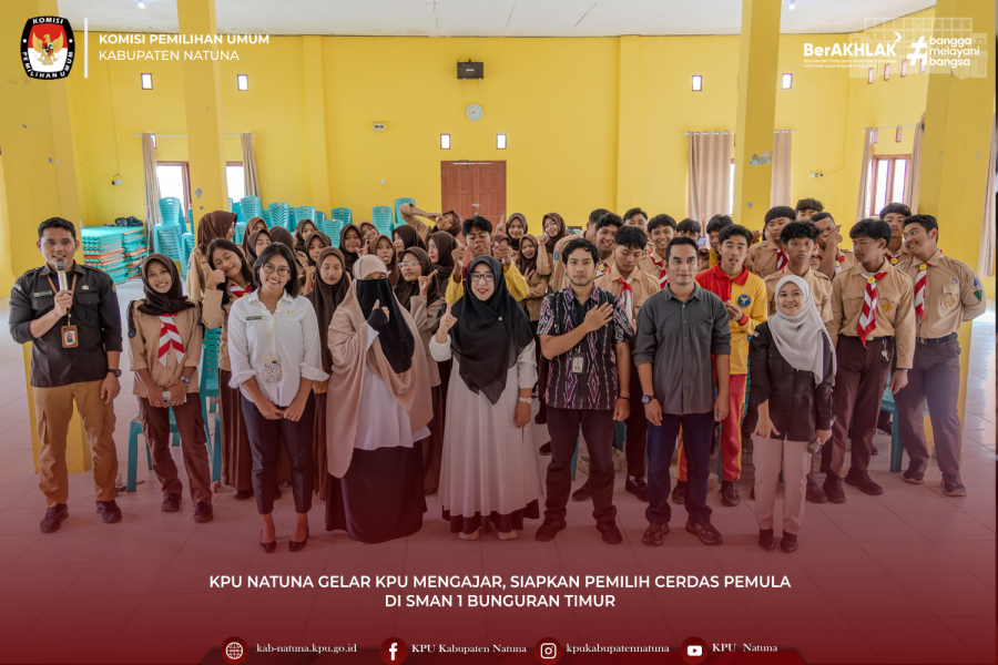 Natuna – KPU Kabupaten Natuna mengintensifkan pendidikan pemilih kalangan muda melalui program "KPU Mengajar". Kegiatan perdana digelar di SMA Negeri 1 Bunguran Timur, Rabu (7 Februari 2024), yang diikuti perwakilan dari pengurus Osis di SMAN 1 Bunguran Timur. Program ini dirancang untuk membekali calon pemilih baru dengan pengetahuan dasar demokrasi, pentingnya partisipasi dalam pemilihan, serta mekanisme pemungutan suara yang benar. Ketua Divisi SosdiklihParmas,Tomi Yanto dalam sambutannya menekankan, "Pemilih pemula adalah masa depan demokrasi kita. Kami ingin memastikan bahwa suara kalian tidak hanya terdengar, tetapi juga berkualitas dan berdasarkan pemahaman yang baik. Partisipasi aktif generasi muda akan menentukan arah pembangunan daerah dan bangsa." Program KPU Mengajar ini rencananya akan berlanjut ke sekolah-sekolah lain di seluruh kabupaten Natuna, sebagai upaya sistematis KPU dalam meningkatkan partisipasi dan literasi pemilih, khususnya di kalangan generasi muda. Dengan kegiatan seperti ini, KPU Natuna berharap dapat mencetak pemilih pemula yang tidak hanya datang ke Tempat Pemungutan Suara (TPS), tetapi juga menjadi pemilih yang cerdas, kritis, dan bertanggung jawab. ....