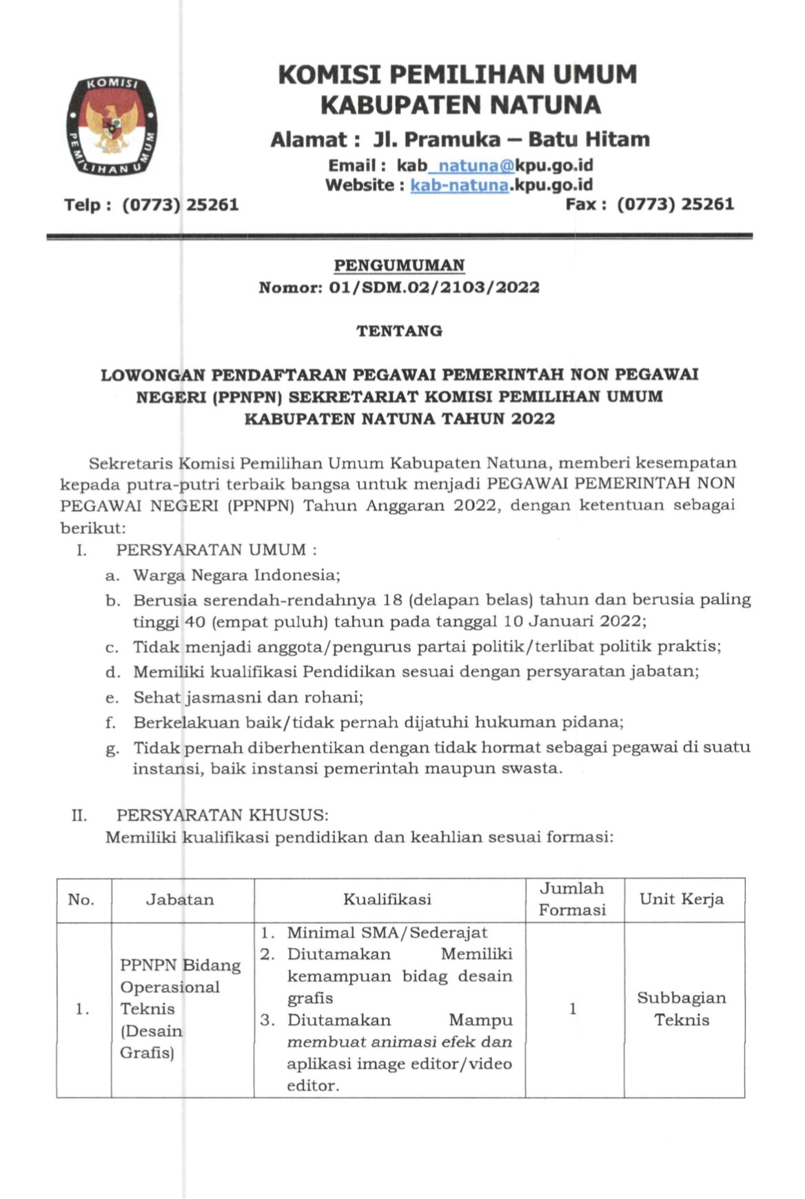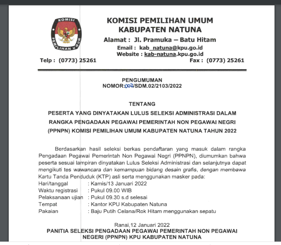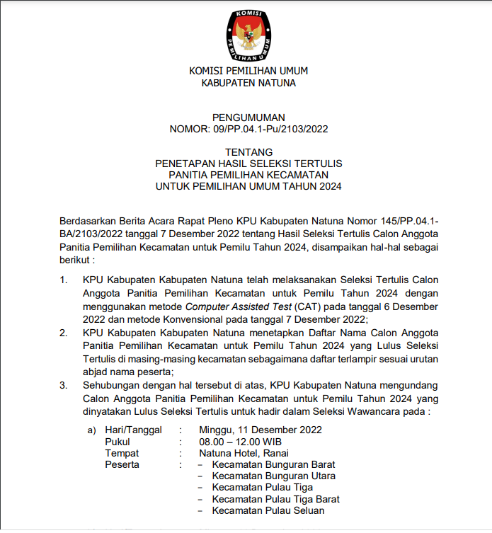 Berdasarkan pada Berita Acara Komisi Pemilihan Umum Kabupaten Natuna Nomor : 133/PK.01-BA/2103/2022 tentang Rancangan Penataan Daerah Pemilihan dan Alokasi Kursi Anggota Dewan Perwakilan Rakyat Daerah Kabupaten/Kota dalam Pemilihan Umum Tahun 2024, dengan ini mengumumkan Rancangan Penataan Daerah Pemilihan dan Alokasi Kursi Anggota Dewan Perwakilan Rakyat Daerah Kabupaten Natuna dalam Pemilihan Umum Tahun 2024 untuk dapat mendapatkan tanggapan dan masukan masyarakat sebagaimana tercantum dalam lampiran pengumuman ini.   untuk pengumuman lengkapnya dapat di download pada tautan berikut: PENGUMUMAN