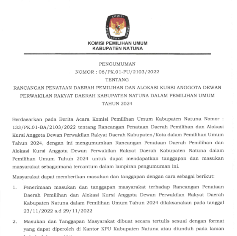 PENGUMUMAN TENTANG RANCANGAN PENATAAN DAERAH PEMILIHAN DAN ALOKASI KURSI ANGGOTA DEWAN PERWAKILAN RAKYAT DAERAH KABUPATEN NATUNA DALAM PEMILIHAN UMUM TAHUN 2024
