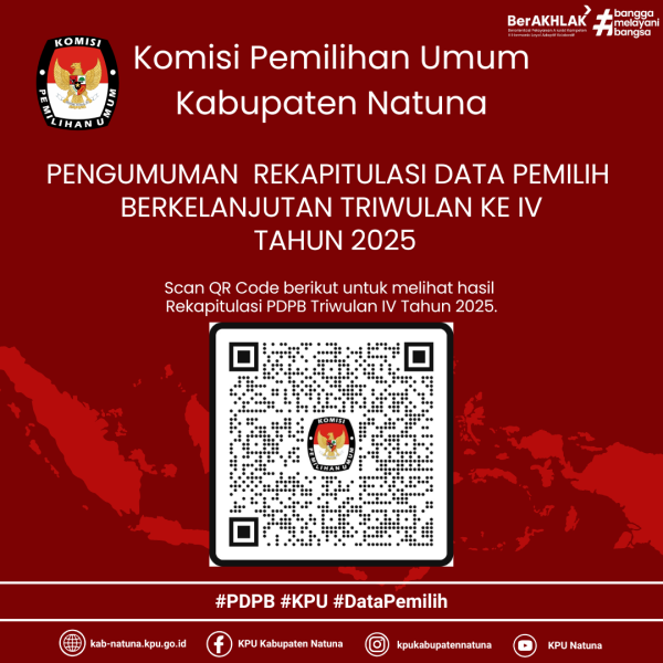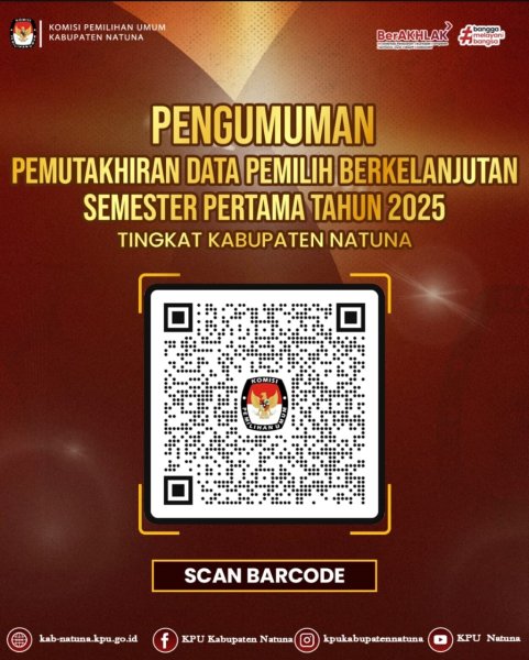 #temanpemilih -Sebagaimana tercantum dalam Pasal 27 Peraturan Komisi Pemilihan Umum Nomor 1 Tahun 2025 tentang Pemutakhiran Data Pemilih Berkelanjutan, dengan ini Komisi Pemilihan Umum (KPU) Kabupaten Natuna mengumumkan hasil Rekapitulasi Pemutakhiran Data Pemilih Berkelanjutan (PDPB) Semester I Tahun 2025 tingkat Kabupaten Natuna untuk mendapatkan masukan dan tanggapan dari masyarakat.