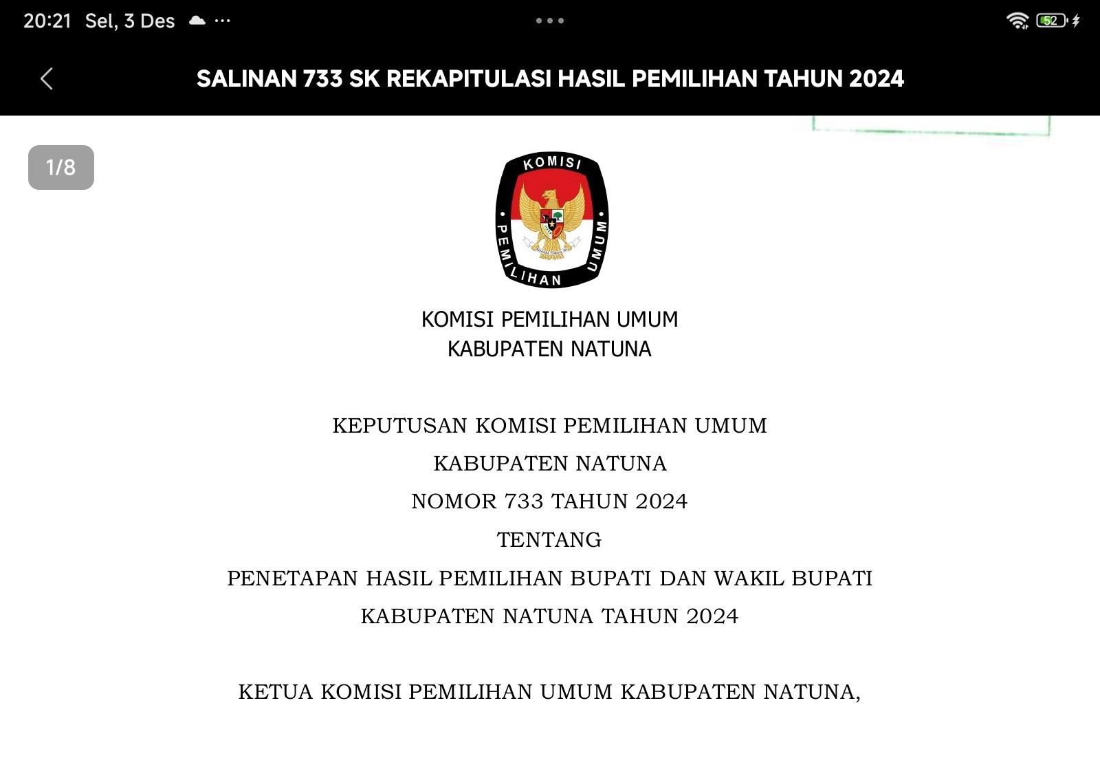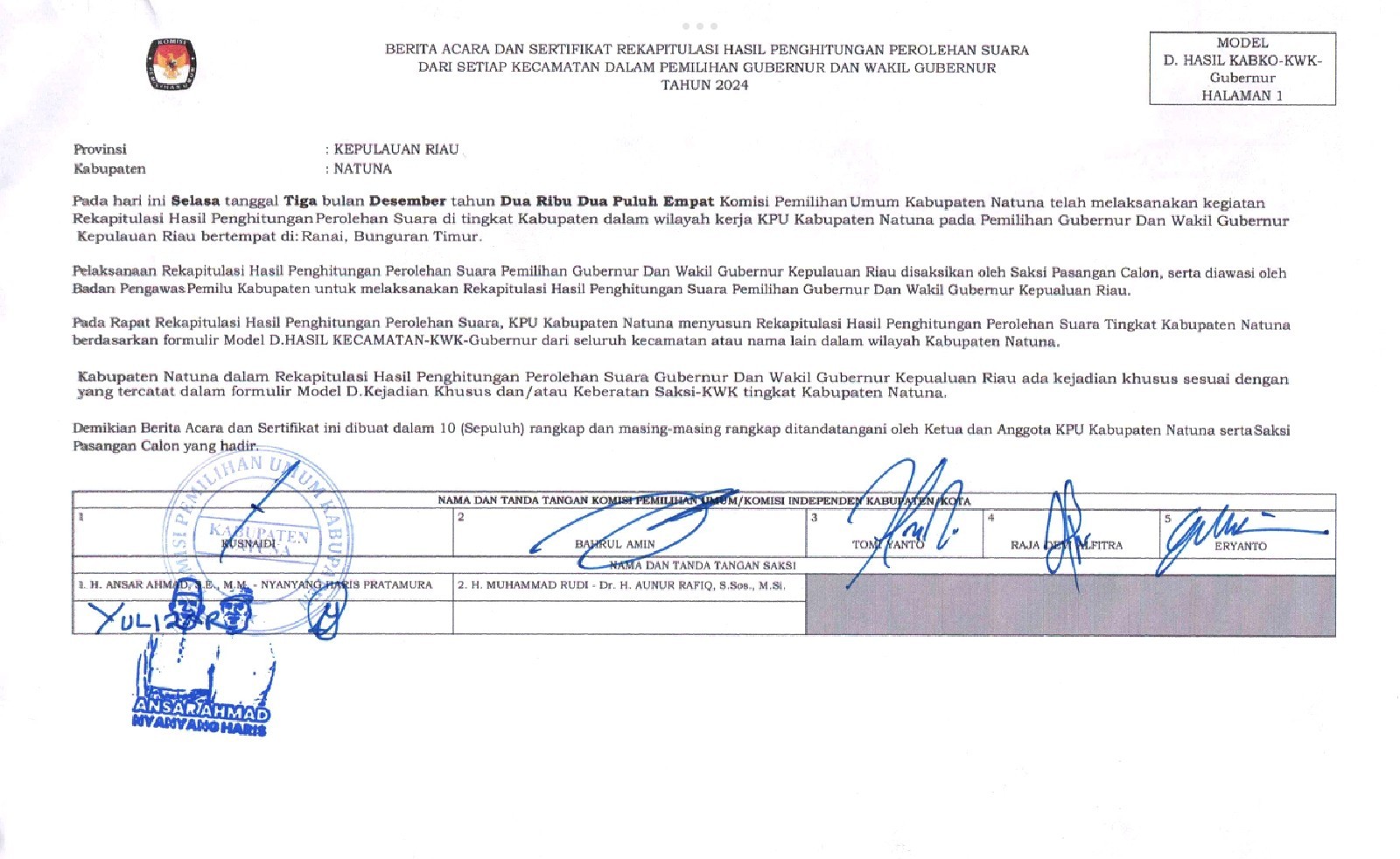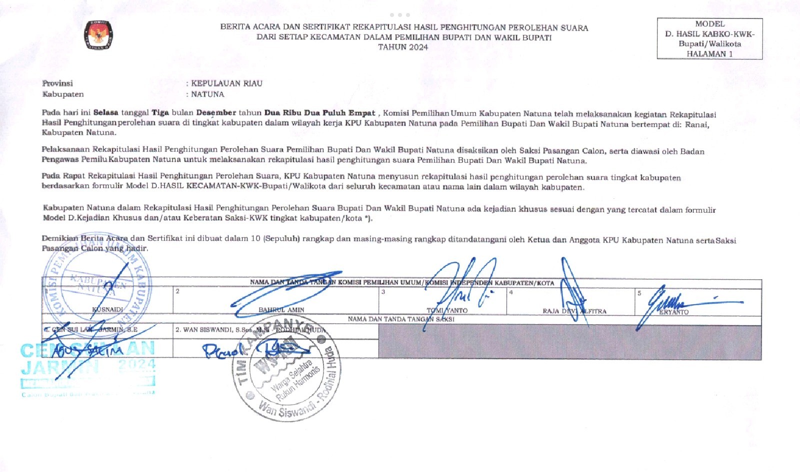 Hasil Pleno Rekapitulasi Hasil Penghitungan Suara Pada Pemilihan Tahun 2024 Kabupaten Natuna Selasa, 03 Desember 2024 07:00 520 Hasil Pleno Rekapitulasi Hasil Penghitungan Suara Pada Pemilihan Tahun 2024 Kabupaten Natuna D hasil Gub Donwload di sini DD hasil Bupati download di sini. SK Penetapan Hasil Pemilihan Bupati dan Wakil Bupati Kabupaten Natuna Download di sini Bagikan: Telah dilihat 520 kali