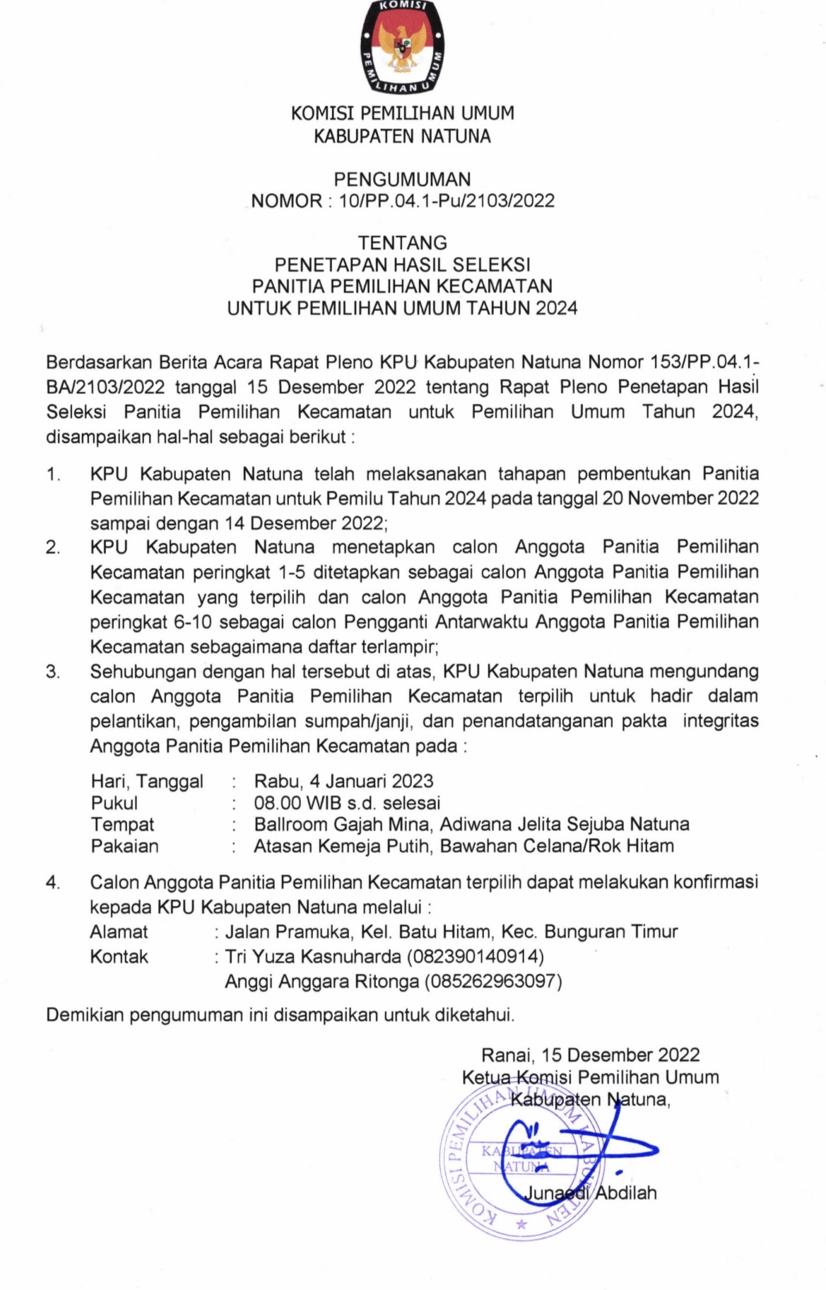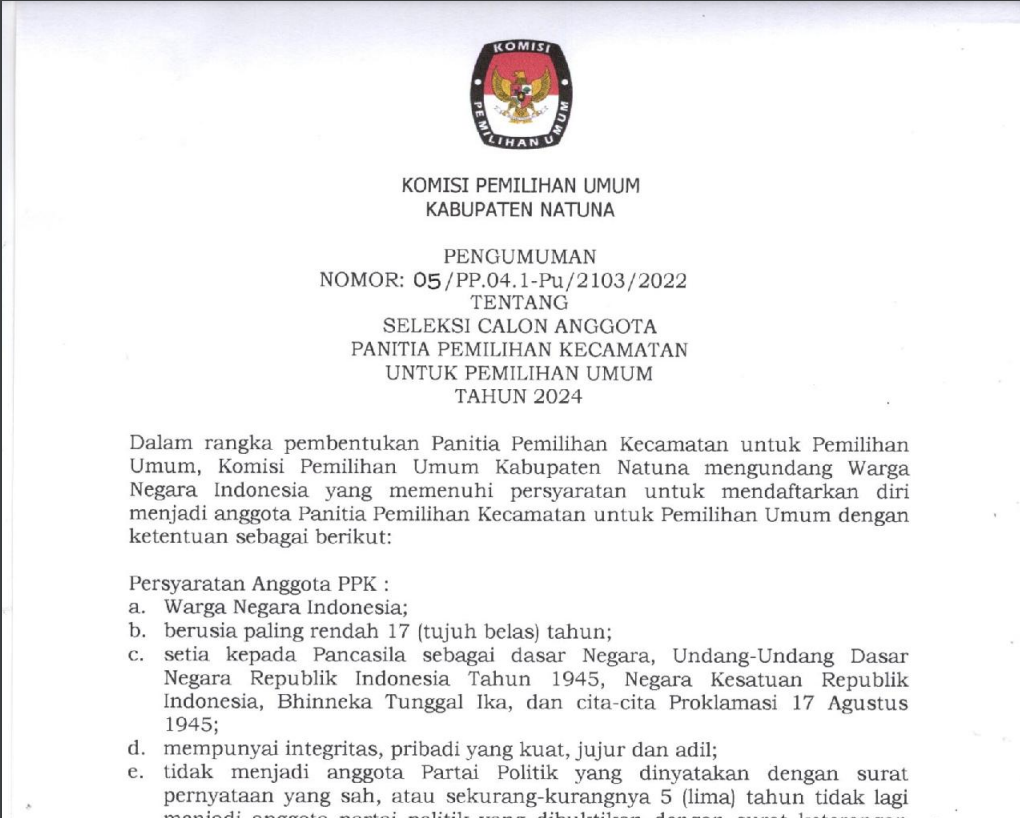 Berikut kami sampaikan Pengumuman KPU Kabupaten Natuna Nomor : 10/PP.04.1-Pu/2103/2022 tentang Penetapan Hasil Seleksi Panitia Pemilihan Kecamatan untuk Pemilihan Umum Tahun 2024